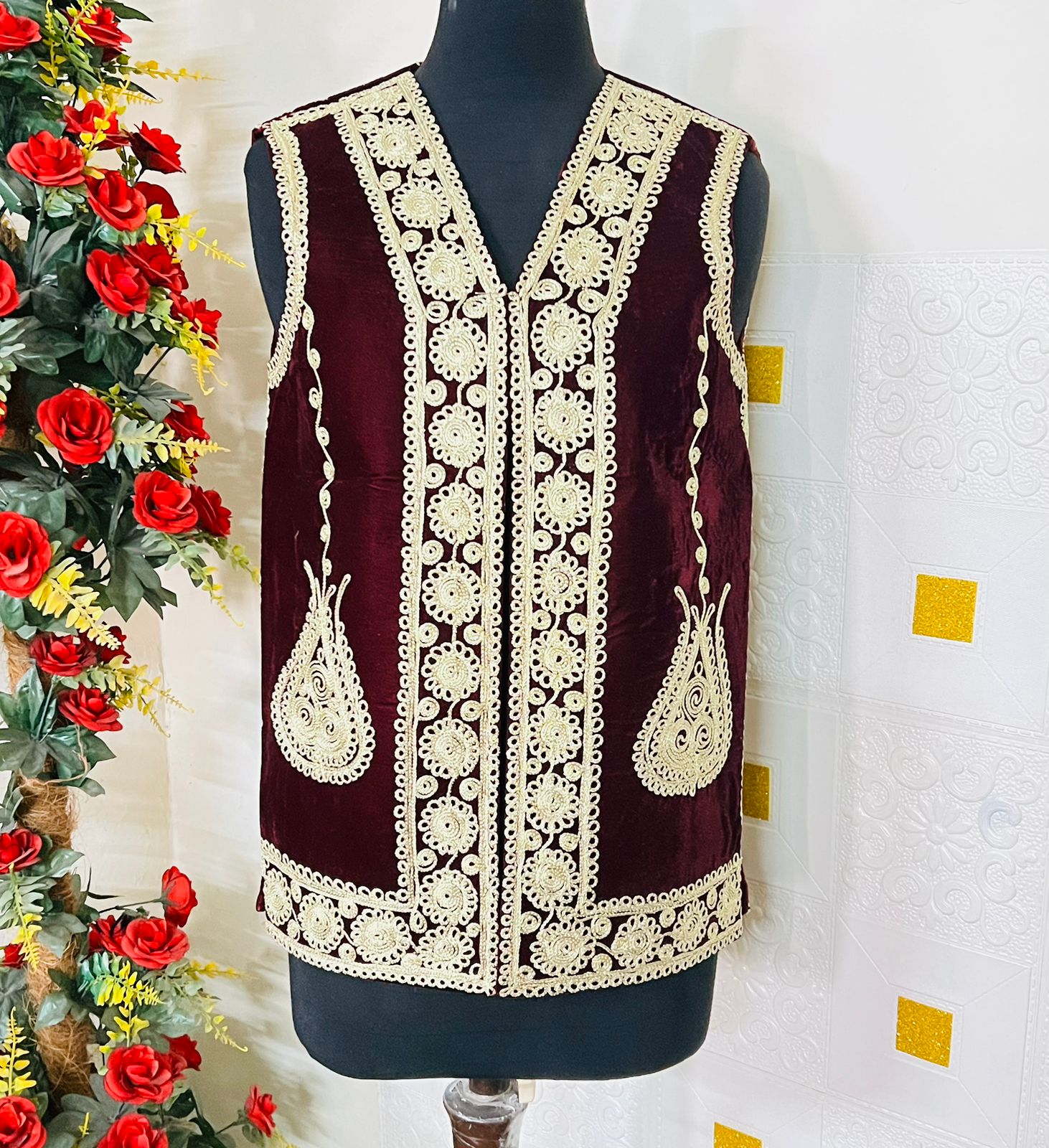 Afghan Burgundy Velvet Vest: Traditional Golden Embroidery, Beaded Mirrors