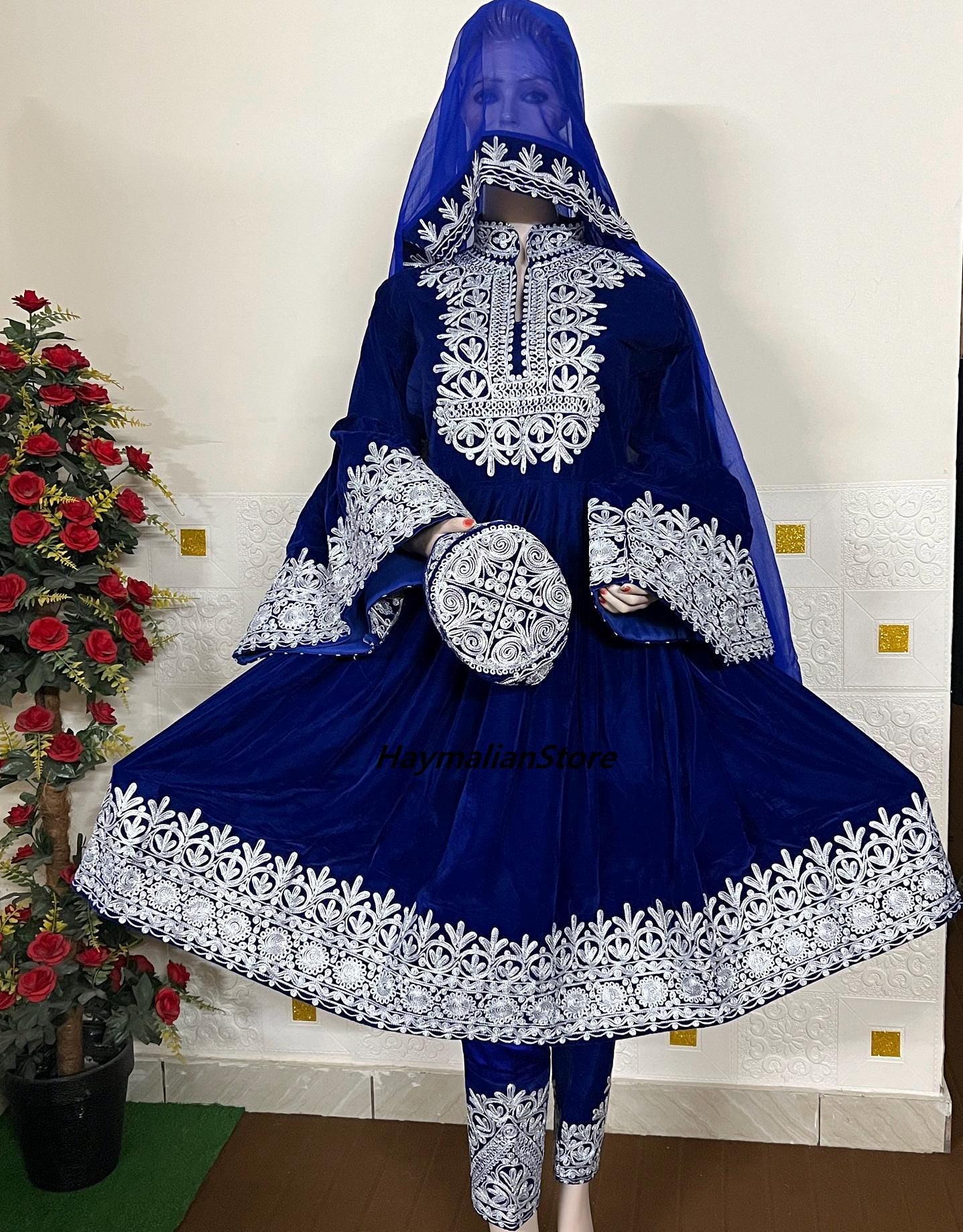 Here is a traditional Afghan Kochi or Kuchi tribal dress in Gray -color, made of fine quality glowing Jamawar fabric.