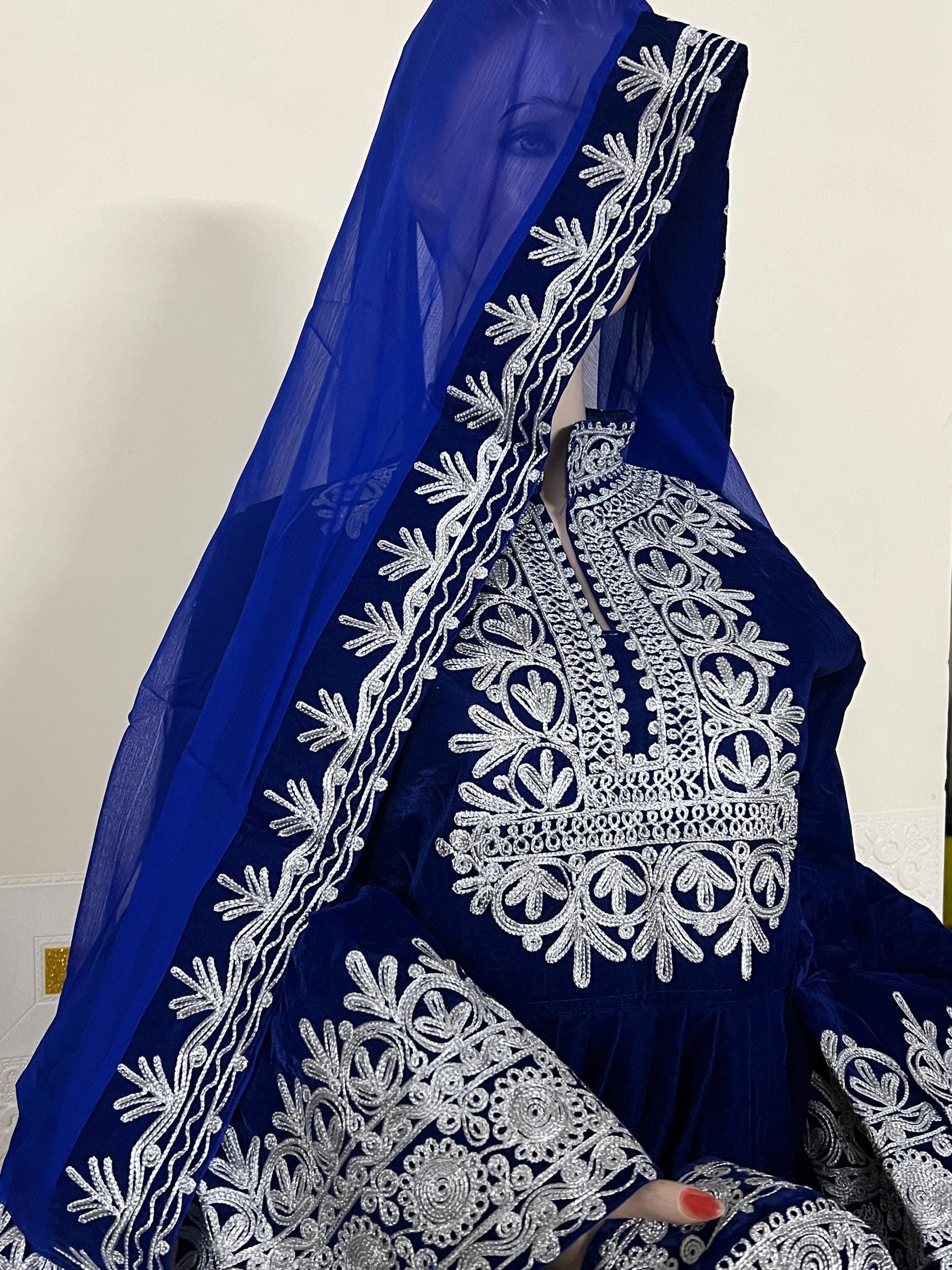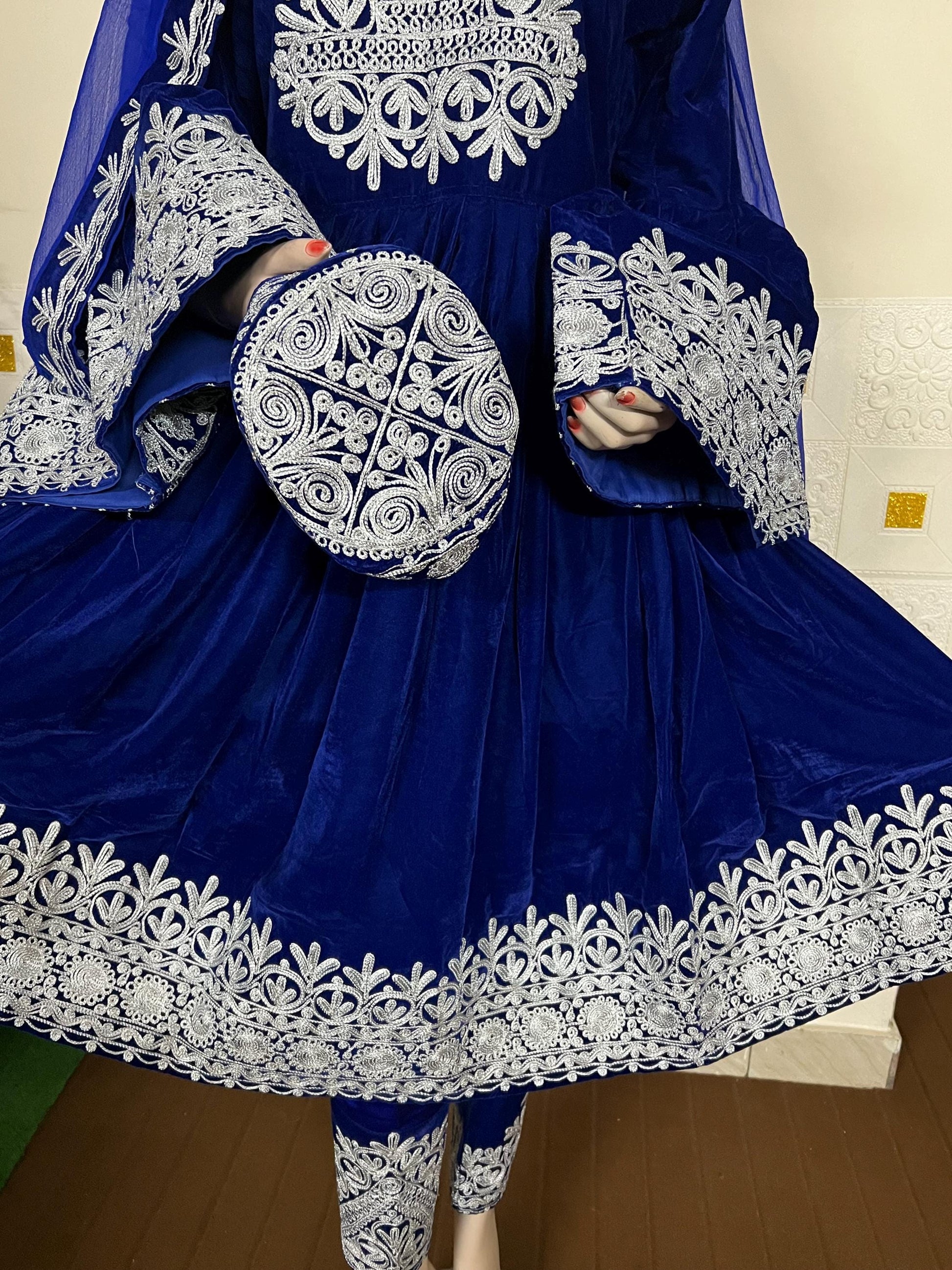 The artwork or needlepoint over the dress is called Mushda, Katawaz and a Sheesha-dozi, which means mirror work and fine embroidery artwork on fabrics.